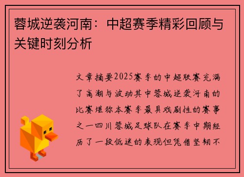 蓉城逆袭河南:中超赛季精彩回顾与关键时刻分析